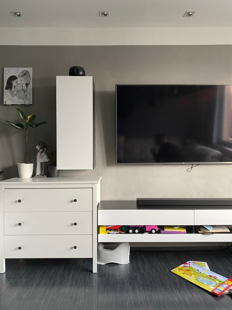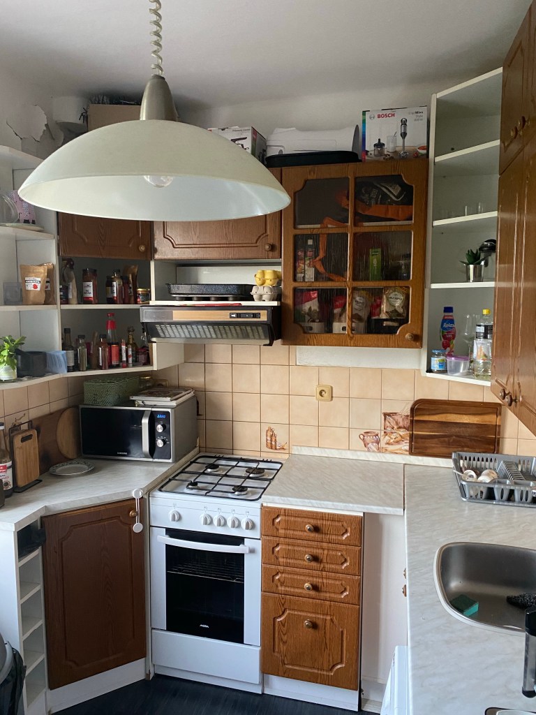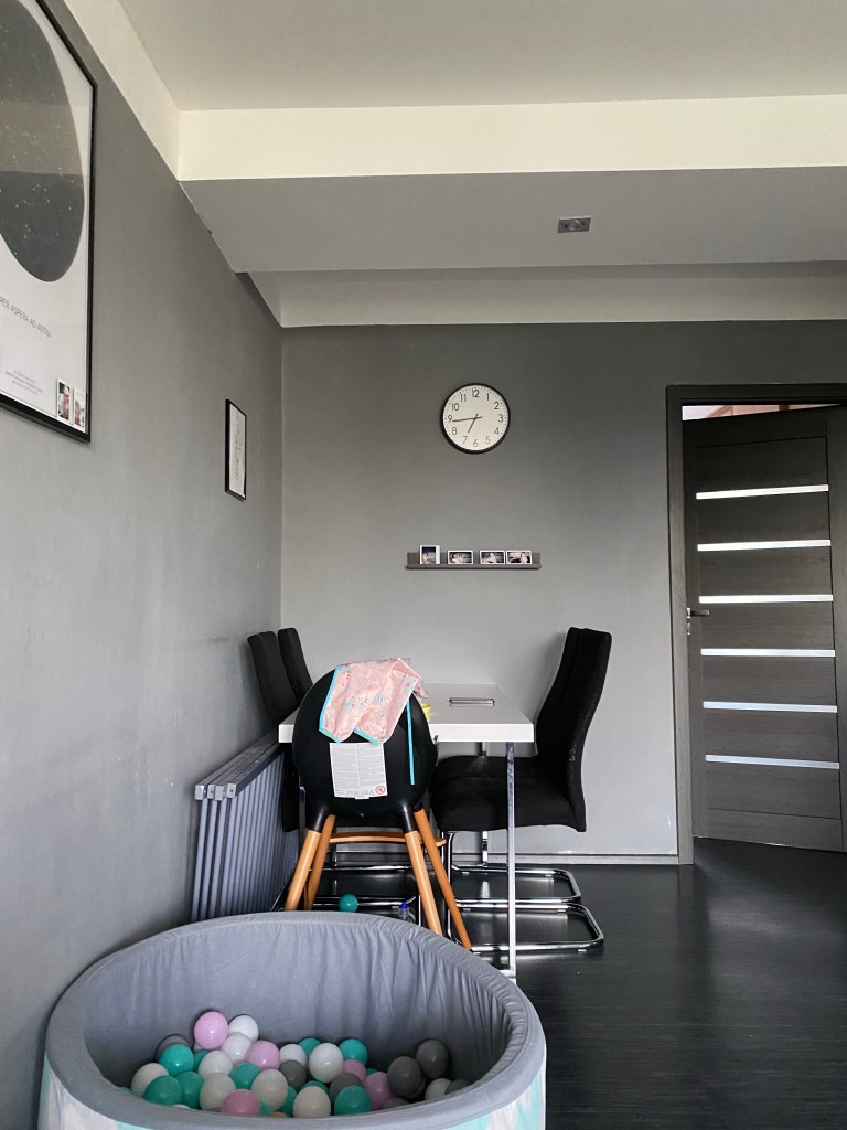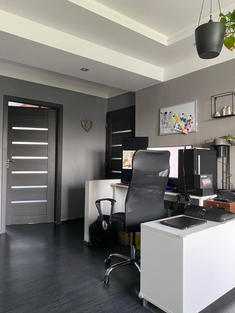 Majitel se snažil vytvořit moderní interiér pomocí tmavých barev – moderní černé dveře , tmavá plovoucí podlaha vytváří pocit unikátnosti. Šedé stěny jsou už podle našeho názoru příliš tmavé a byt působí spíše menším dojmem než ve skutečnosti je. V bytě jsou nové rozvody elektřiny kromě kuchyně. Kuchyně je původní a nový majitel by měl uvažovat o její rekonstrukci s výměnou kabelů od rozvodů elektřiny. Internetové dveře v chodbě nevadí s moderními obložkami obývacím pokoji.