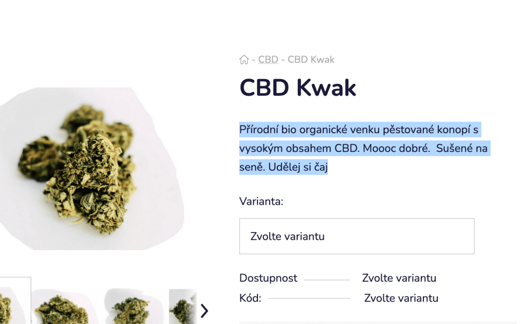Náš produkt je čisté CBD pěstované na normálním slunci zalévané dešťovou vodou zasazené na kompostovaném místě, kde je spousta živin, které naše CBD obohacují. Naší cílovou skupinou jsou lidé, kteří hledají pocit štěstí a uspokojení při cestě za vlastním zdravím i zdraví jiných lidí. Proto doporučejeme našim hospodyňkám, aby uvařili s našeho – vašeho CBD Kwak čaj hodný mistrů. Tento čaj obsahuje zdravé komponenty na molekulární úrovni a pomáhá organismu nést následky znečištění a působit na očistný proces blahodárnými účinky. Také je možné naše – vaše CBD kouřit anebo vkládát do alkoholu. V této zemi není legální prodáva CBD pro přímou spotřebu, proto prosím příjměte naše CBD jako dar, který Vám nesla příroda a kupte si ho pro sebe nebo pro někoho jiného jako dárek. Naše CBD Kwak produkt je dárek vašemu zdraví. Na zdraví